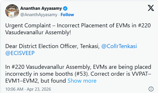 இந்த சூழலில், வாசுதேவநல்லூர் தொகுதியில் போட்டியிடும் பாஜக வேட்பாளர் ஆனந்தன் அய்யாசாமி தரப்பில் இருந்து முக்கியமான புகார் எழுப்பப்பட்டது. அவர்கள், மின்னணு வாக்குப்பதிவு இயந்திரங்களில் வரிசைமுறை முறைகேடு மற்றும் தொழில்நுட்ப சிக்கல்கள் உள்ளதாகக் கூறி தேர்தல் ஆணையத்திடம் புகார் அளித்தனர்.